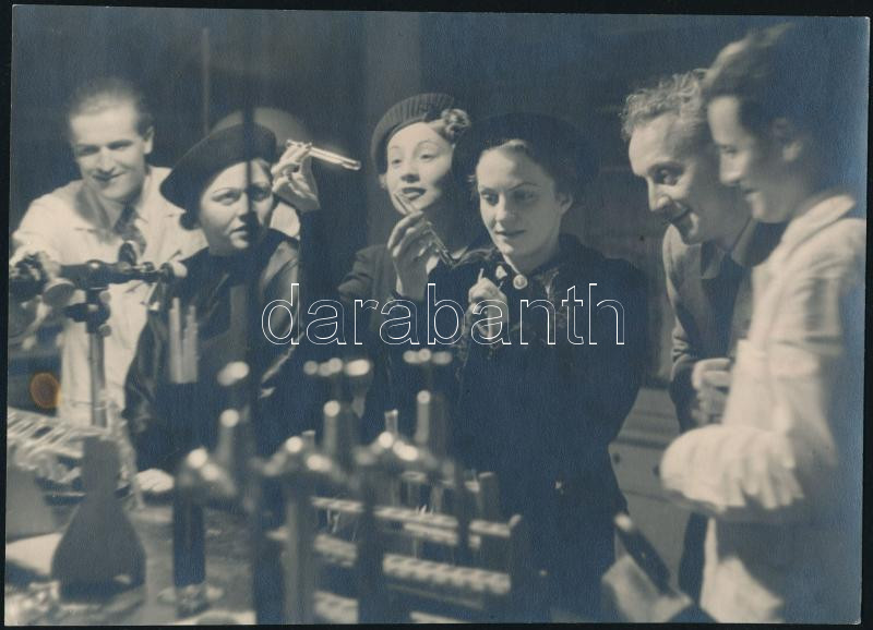 cca 1935 Szent-Györgyi Albert laboratóriumában Szegeden három színésznő kőrében (Gombaszögi Ella, Fejes, Bulla Elma) Liebmann Béla aláírt fotója / 1935 Nobel Prize winner Albert Szent-Györgyi in his laboratory. 22x16 cm