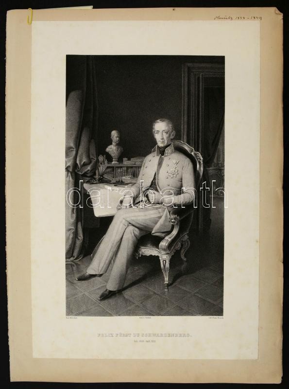 cca 1853 Felix Ludwig Johann, Fürst zu Schwarzenberg (1800-1852) osztrák miniszterelnök és külügyminiszter nagyméretű kőnyomatos portréja. Franz Heinrich llitográfiája. / cca 1853 Felix Schwarzenberg Ausrtian prime minister and statesman. Large lithographic image Page size:32x45 cm