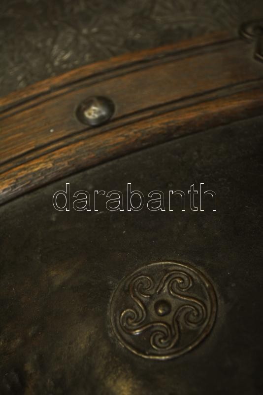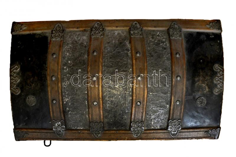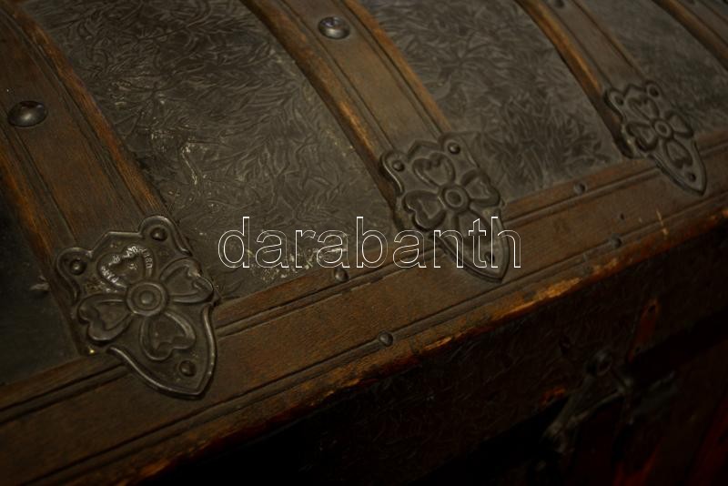 XIX. századi utazóláda, hajóláda mintás réz borítással, búzavirág és négylevelű lóhere mintával. Jelzett. Egyik füle leszakadt, néhány kisebb veret hiányzik róla. a lábrészből kis darab hiányzik 52x42x73 cm Hozzá szobai tartó. Jó optikai állapotban. /