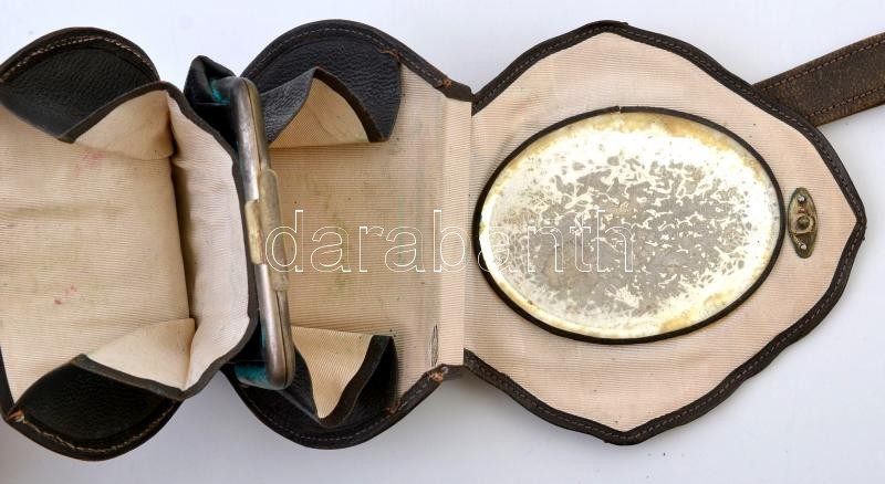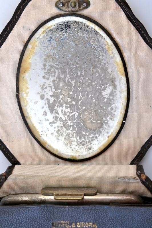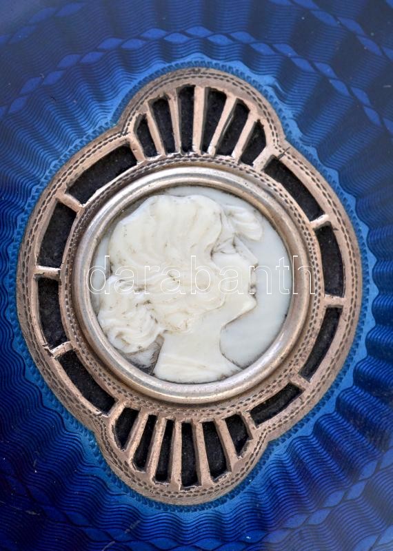 cca 1910 Nissel & Sikora Wien színházi táska, ezüst, zománc berakással és csont kámeával a közepén, belseje hasított bőr kisebb szakadásokkal, jelzett, 12×10 cm / cca 1910 Nissel&Sikora Wien theatra case, silver (Ag.), with enamel inlay, with small damages, with hallmark, 12×10 cm