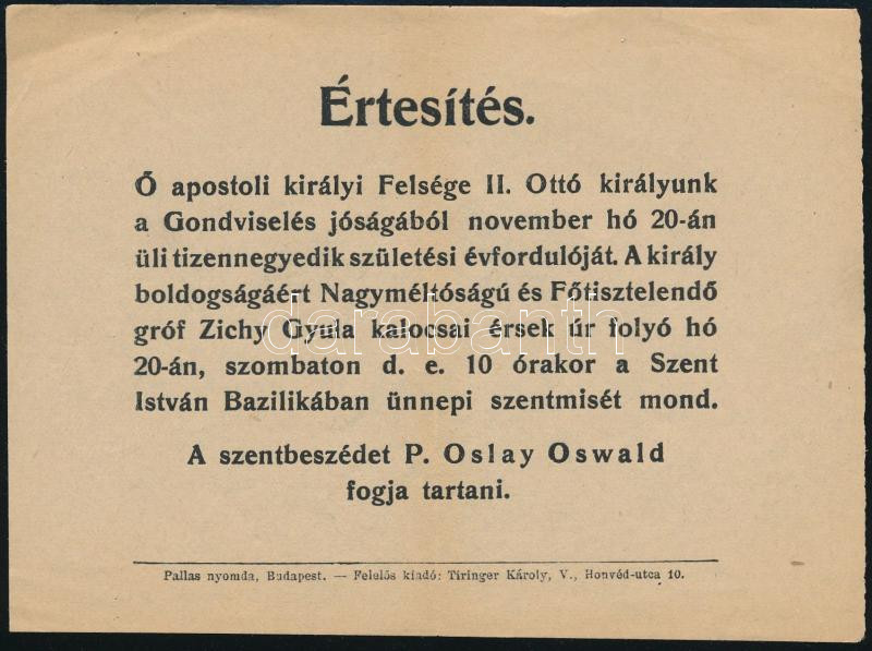 Leírás: 1926 Bp., Habsburg Ottó(1912-2011) 14. születésnapja alkalmából mondott misére szóló értesítés