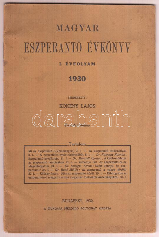 1930 Magyar Eszperantó Évkönyv I. évfolyam. Szerk.: Kökény Lajos. Bp.,... https://www.darabanth.com/hu/26-Nagyaukcio/26.1/Festmeny-mutargy-papirregiseg-egyeb/Nyomtatvanyok~10311/1930-Magyar-Eszperanto-Evkonyv-I-evfolyam-Szerk-Kokeny-Lajos-Bp-1930-Hungaria-Heroldo-~II1474238