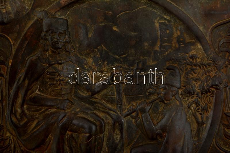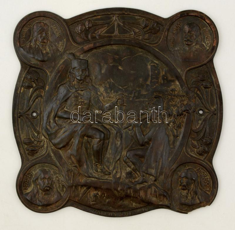 Leírás: cca 1907 Kallós Ede (1866-1950): II. Rákóczi Ferenc fali plakett. Bronzirozott vas. Jelzett. 33,5 x 33,5 cm