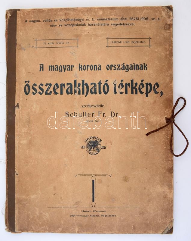 1906 A Magyar Korona országainak összerakható térképe, Szerk.: Schuller Fr., Nagyszeben, Neuzil kiadása. Kiadói félvászon mappában, kopottas borítóval, kissé viseltes gerinccel, két kissebb hiánnyal (Nyitra, és Arad megyéknél), valamint a mérő pálcika hiányzik, a kirakáshoz kiadott segédlettel, a melléklet szélei gyűröttel, viseltesek.