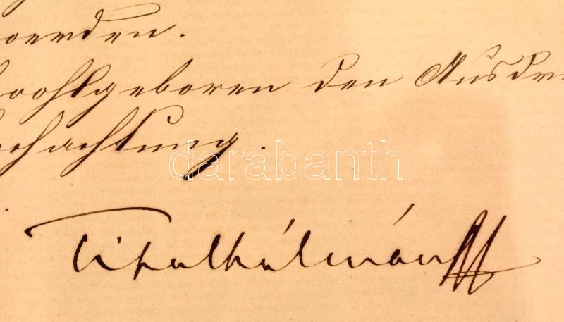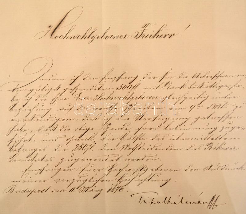 1875 Tisza Kálmán (1830-1902) belügyminiszter, későbbi miniszterelnök aláírt levele német nyelven, melyben Békés megyének juttatott összegről rendelkezik. Üvegezett keretben.