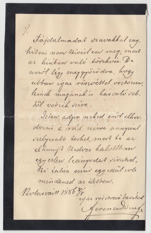 1886 Ferencz József (1835-1928) Erdélyi unitárius püspök saját kézzel írt levele Szél Kálmán református esperesnek (1838-1928) melyben lánya, Szél Piroska halálakor kondoleál 2 beírt oldal