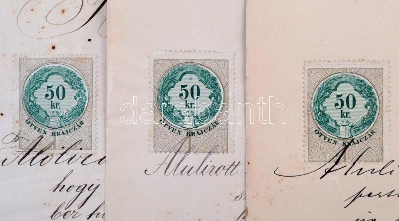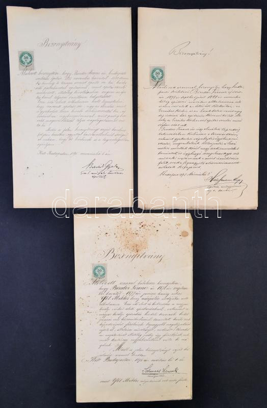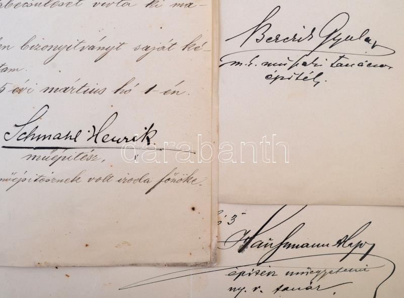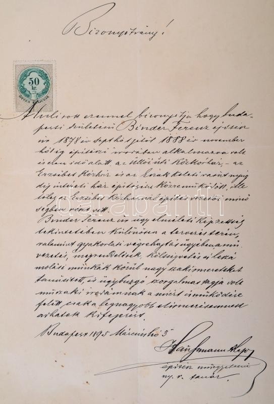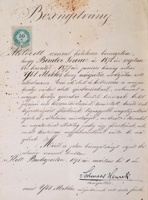 1895 Binder Ferenc építész gyakorlatot igazoló bizonyítványai, Hauszmann Alajosnak (1847-1926), Berczik Gyulának (1853-1933), építészek, valamint Schmahl Henriknek (1846-1912) építész, Ybl Miklós építész volt irodafőnökének az aláírásaival, 3 db 50 kr. illetékbélyeggel.