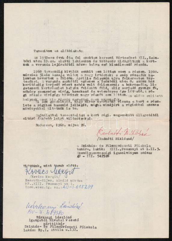 Radnóti Miklósné (1912-2014) által írt és saját kezüleg aláírt nyilatkozat, melyben tanusítja Vértes O. József és Vértes O. Aguszta kertjének feldúlását. A nyilatkozat tanúi Kovács Margit (1902-1977) keramikus, Várkonyi Lászlóné a Színház és Filmművészeti Főiskola párttitkára