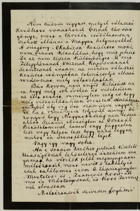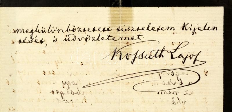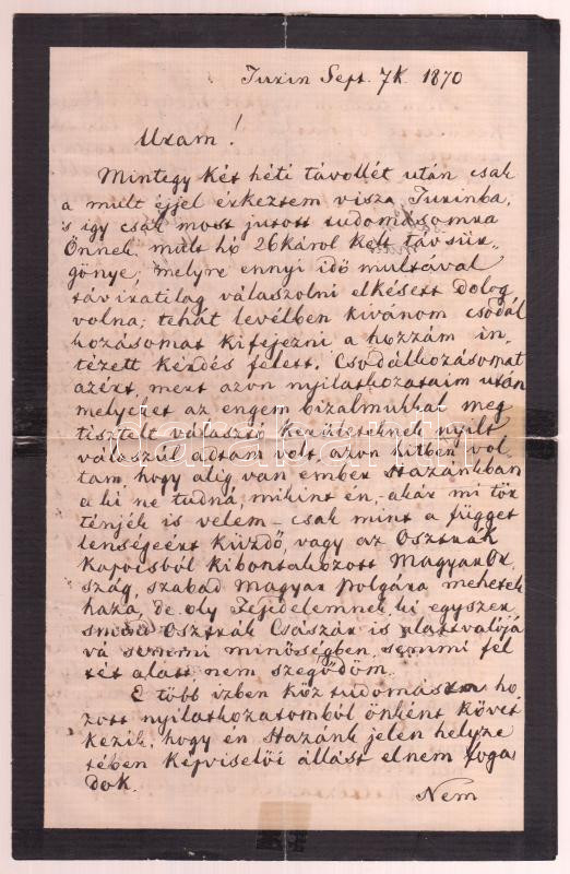 VÉDETT! 1870 Kossuth Lajos (1802-1894) levele ismeretlennek. Szenvedélyes hangú saját kézzel írt levél nagyon érdekes tartalommal. Jelzi, hogy tudomást szerzett arról, képviselővé választották, de a hivatalt nem fogadhatja el, hiszen "alig van ember Hazánkban, a ki ne tudná, miként én, - akármi is történjék velem - csak mint a függetlenségért küzdő, vagy az Osztrák Kapocsból kibontakozott Magyarország szabad polgára mehetek haza..." " ... de ha e reményem teljesül annyi bizonyos, hogy Magyarország nem lesz sziámi ikerségben az Osztrák Birodalommal, hanem vagy független lesz, vagy talpon lesz hogy azzá legyen mikor én szent földére lépek. Vagy így, vagy soha." Kettő és egyharmad beírt oldal. Két helyen ragasztóval megerősítve.