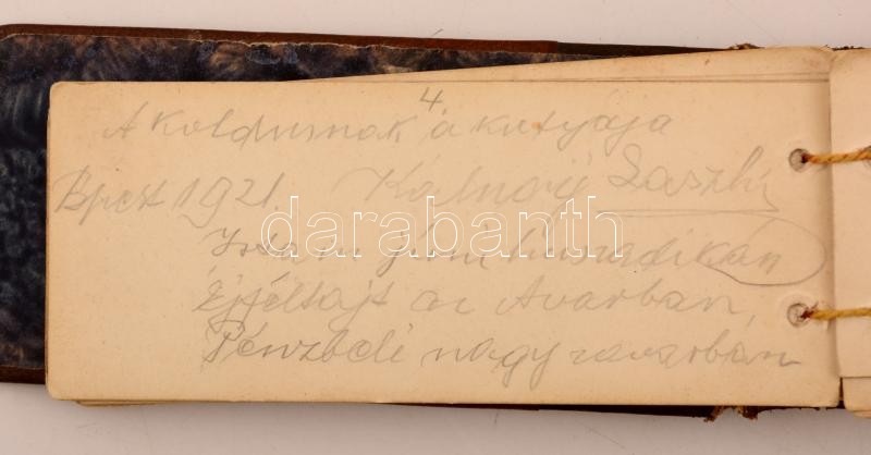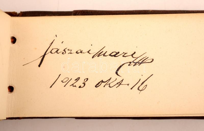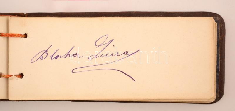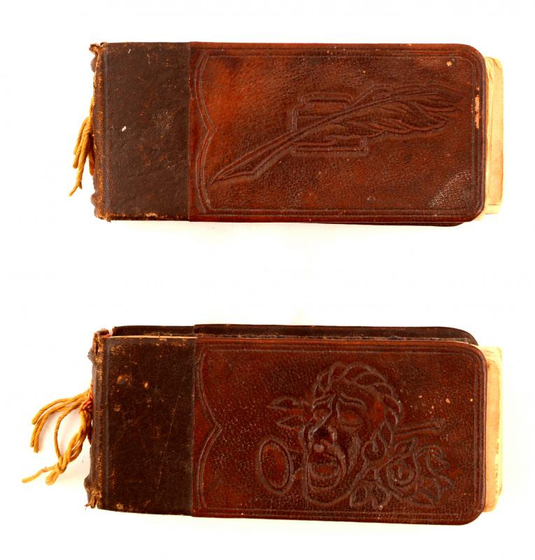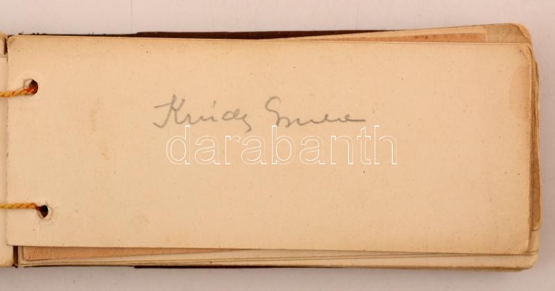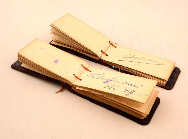 VÉDETT! cca 1930 A tabáni Avar vendéglő emlékkönyve aláírásokkal. A legendás tabáni kiskocsma, melyről Krudy Gyula is többször írt, színészek, mévészek és írók kedvelt tivornyázó helye volt. A két bőrkötéses füzetkében összesen kb 90 aláírás található, mind a kor híres embereitől. Krudy, Blaha Lujza, Bajor Gizi, Almássy Endre, Csók István, Pethes Sándor, Cholnoky Viktor, Csortos Gyula, Szekula Jenő, Harsányi Zsolt, Bródy Sándor, Rippl RónayJózsef és sokan mások. A két könyvecske bőrborítóján a színészet és az írás allegorikus ábrázolása található valamint W. E. monogram. Az aláírások mellett tartalmazza Kálnay Lászlónak a vendéglőben írt versét, melyet fizetségképp írt, A könyvecskék mérete 15x6 cm