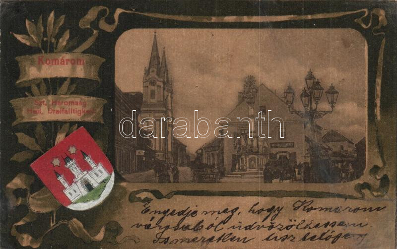 Komárom, Komárno; Szentháromság szobor Mészáros András üzletével, címeres, Art Nouveau litho keret. Freisinger Mór kiadása / statue with shop, coat of arms, Art Nouveau litho frame (r)