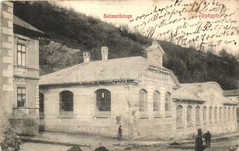 Leírás: Selmecbánya, Banska Stiavnica, Schemnitz; Breischneider Zsigmond és fia cipőgyára. Grohmann kiadása / shoe factory
