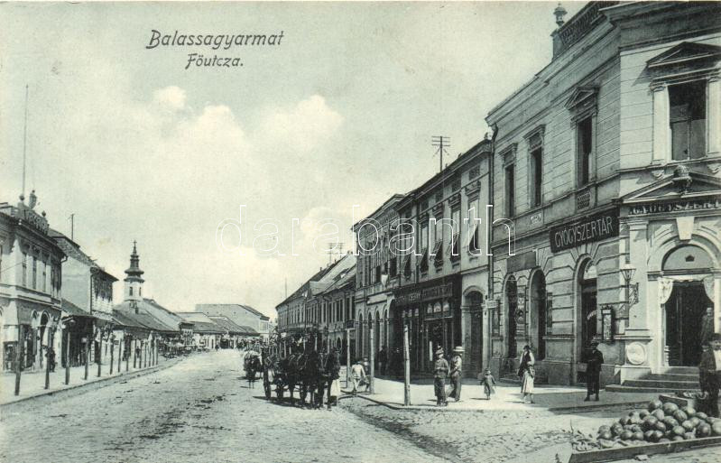 Leírás: Balassagyarmat, Fő utca, gyógyszertár, Platthy és Cserny üzlete