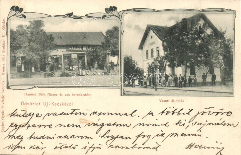 Leírás: Újkécske, Tiszakécske; vasútállomás, Hanusz Béla fűszer és vaskereskedése és saját kiadása, Art Nouvea