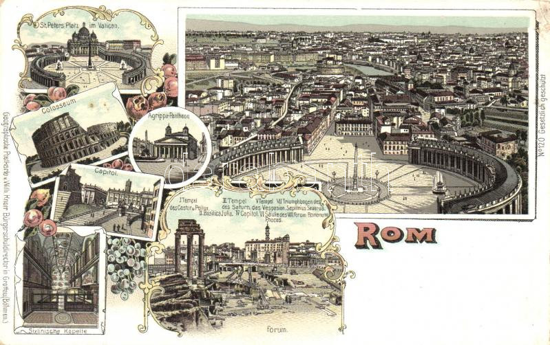 Leírás: Rome, Rom; Sixtinische Kapelle, Forum. Geographische Postkarte v. Wilhelm Knorr No. 120. Art Nouveau litho (small tear)
