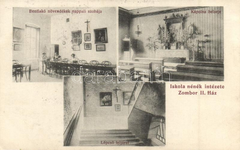Leírás: Zombor, Sombor; Iskola Nénék Intézete, II. ház; bentlakó növendékek nappali szobája, kápolna, lépcső feljárat, belső / girl school interiors