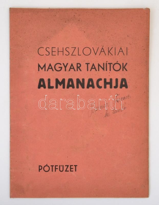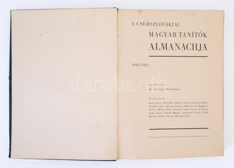 A csehszlovákiai magyar tanítók almanachja 1918-1933. Szerk.: Szerényi Ferdinánd. Pozsony, [1934], Slovenská Grafika. Kopott, kicsit foltos vászonkötésben, egyébként jó állapotban. /