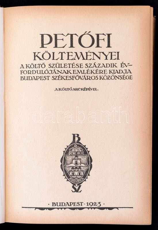 Petőfi (Sándor) Költeményei. A költő születése századik évfordulójának emlékére kiadja Budapest Székesfőváros közönsége.. Bp., 1923, Budapest Székesfőváros Házinyomdája, 1 t.+XI+626 p. Kiadói gazdagon ezüstözött egészvászon kötés. Jó állapotban.