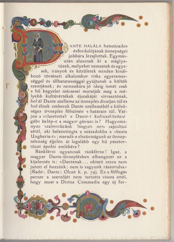 Reiner János (szerk.): Dante-emlékkönyv. Budapest, 1924, Stephaneum nyomda R.T. Sorszámozott: 330. sz. példány. Aranyozott, színezett keretlécekkel díszített fejezetkezdő lapokkal, a külső és belső címlapon színes miniatúra illusztrációval. Kiadói, színes, illusztrált kartonálásban