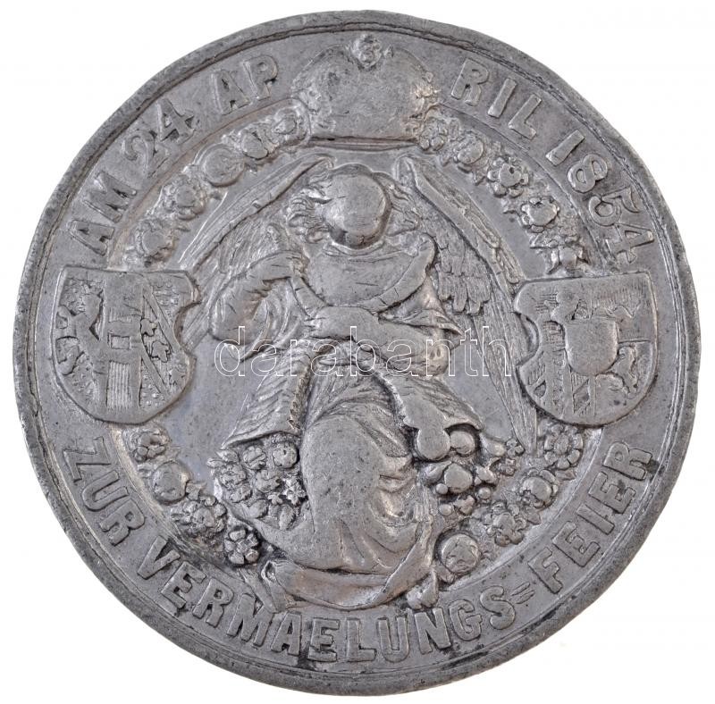 Wenzel Seidan (1817-1870) 1854. "I. Ferenc József - Erzsébet / Mennyegző ünnep 1854. április 24-én" ón emlékérem (20,68g/37mm) T:3 ph. / Hungary 1854. "F. JOSEPH I. - E. ELISABETH / ZUR VERMAELUNGS-FEIER - AM 24 APRIL 1854" Sn commemorative medallion for the espousal celebration of Franz Joseph und Elisabeth. Sign.: Wenzel Seidan (20,68g/37mm) C:F edge error