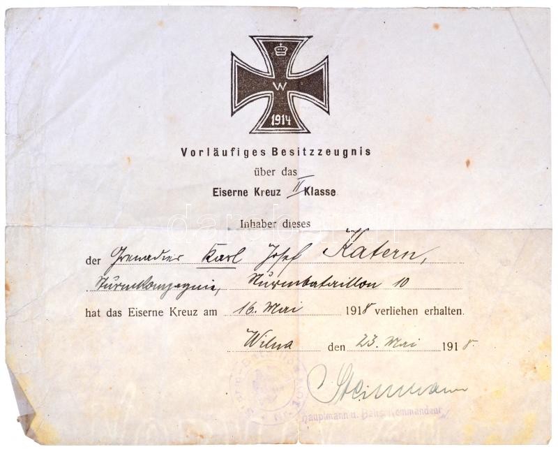 Német Birodalom 1914. "Vaskereszt 2. osztály" kitüntetés mellszalag nélkül, "CD 800 (Carl Dillenius Pforzheim)" jelzéssel a függesztő karikán, viselésre jogosító okirattal, melyet 1918-ban a 10. Rohamzászlóalj katonája kapott. T:2 /