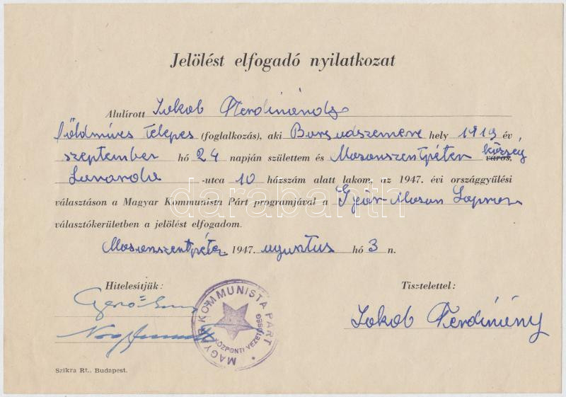 Leírás: 1947 A Magyar Kommunista párt jelölést elfogadó nyilatkozata Gerő Ernő és Nagy Imre, késöbbi miniszterelnök saját kezű aláírásával