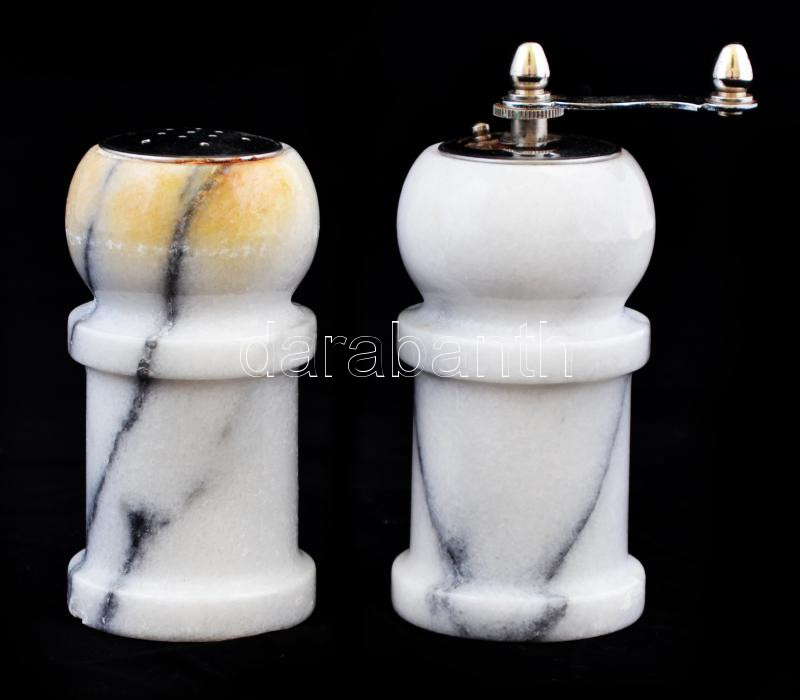 Leírás: Alabástrom sószóró és borsdaráló, fém rátétekkel, m: 13 cm
