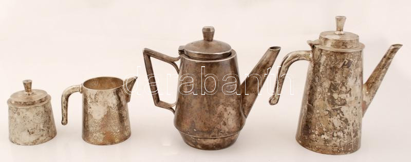 Leírás: Fém teás kanna (2 db), cukortartó, tejkiöntő, összesen: 4 db, m:10-20 cm, egyik horpadt