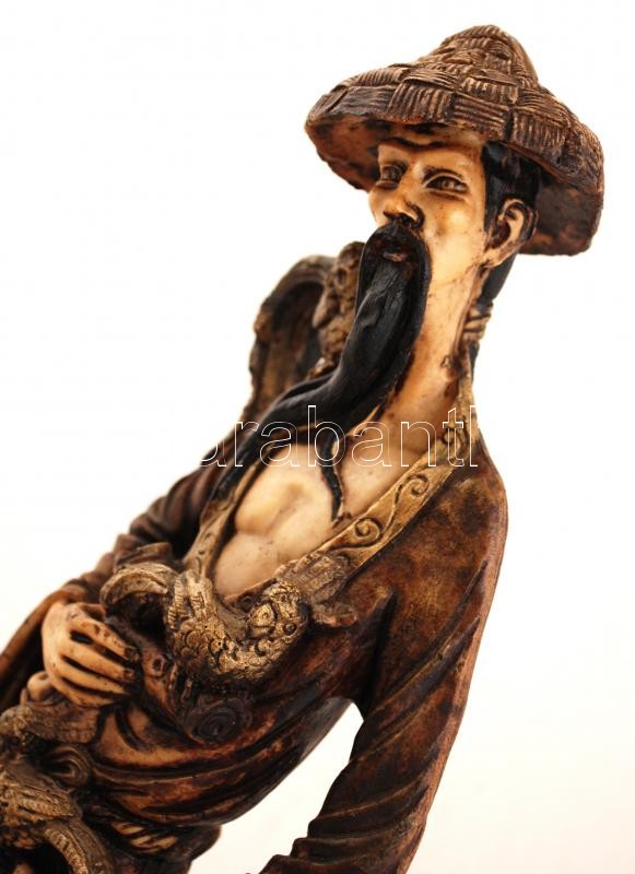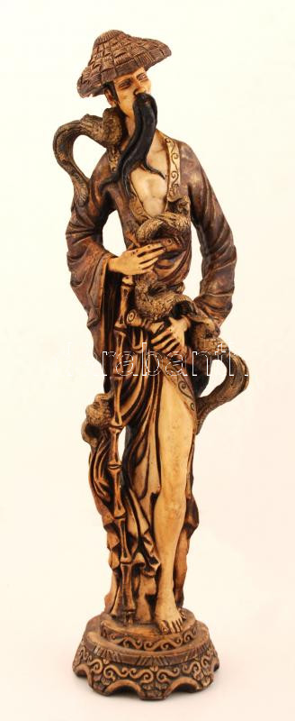 Leírás: Kínai férfi bottal és madarakkal, festett műgyanta, kalapján apró lepattanás, m:45 cm