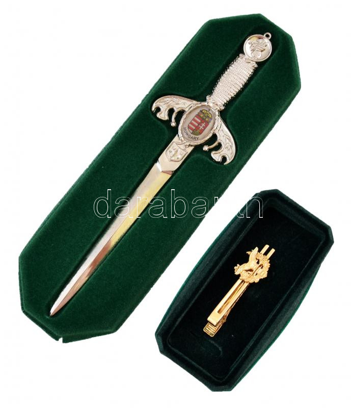 Leírás: Koronás magyar kiscímerrel díszített fém levélbontó tőr + honvédségi fém nyakkendőtű
