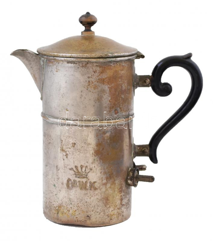 Leírás: Régi elektromos fém vízforraló,fa fogóval, jelzett (Therma), címerrel (Wolf Károly) , m:18 cm