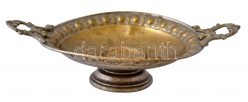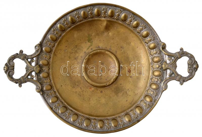 Leírás: Rezezett fém füles kínáló, horpadással, 31×21 cm