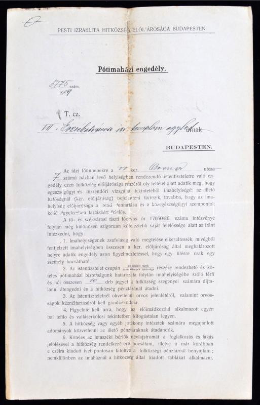 1919 Pótimaházi engedély, Pesti Izraelita Hitközség Elöljárósága Budap... https://www.darabanth.com/hu/260-Gyorsarveres/260.0/Festmeny-mutargy-papirregiseg-egyeb/Judaika~22/1919-Potimahazi-engedely-Pesti-Izraelita-Hitkozseg-Eloljarosaga-Budapesten-okmanybelyeg~II1287183
