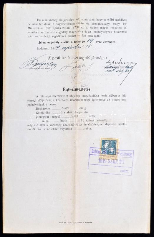 Leírás: 1919 Pótimaházi engedély, Pesti Izraelita Hitközség Elöljárósága Budapesten, okmánybélyeggel (30fill.), 34x21cm