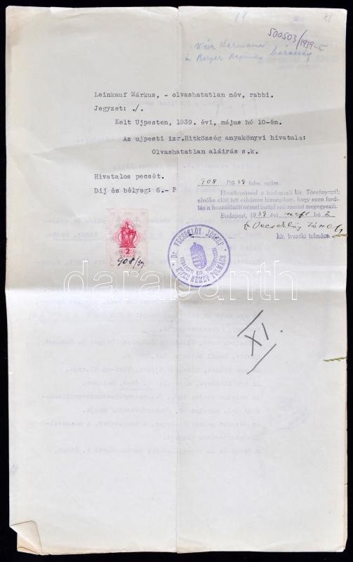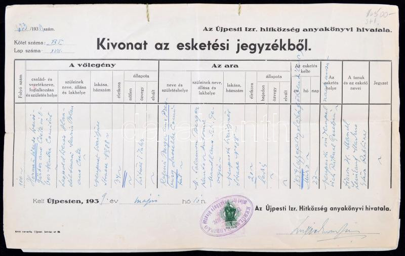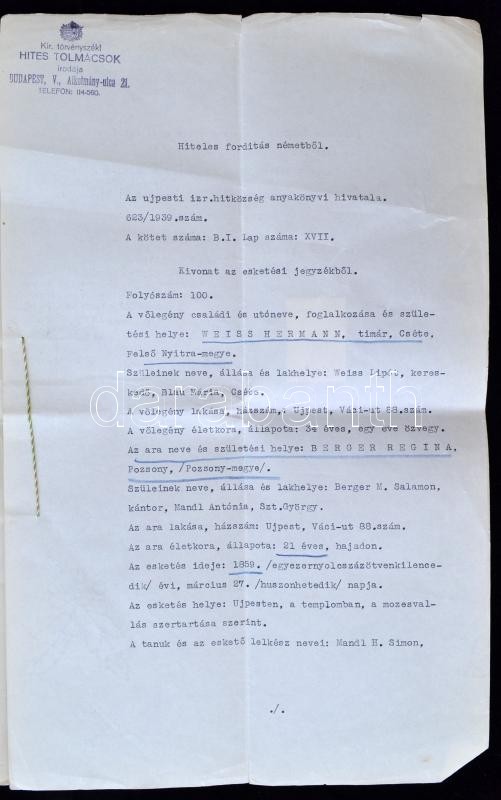 Leírás: 1939 Német nyelvű házassági anyakönyvi kivonat az újpesti izraelita hitközségből, hozzá csatolt hitelesített magyar nyelvű fordítással