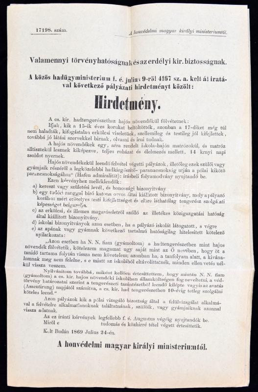 Leírás: 1869 Hirdetmény a cs. kir. hadtengerészethez hajós növendék felvételről, pp.:2, 34x21cm