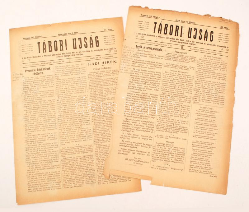 1915 Przemyśl, Tábori Újság, a 23. honvéd gyalogezred által Przemyśl első és második ostroma alatt naponta-kétnaponta megjelentetett újság 100., 104. lapszáma (február), szélein szakadásokkal