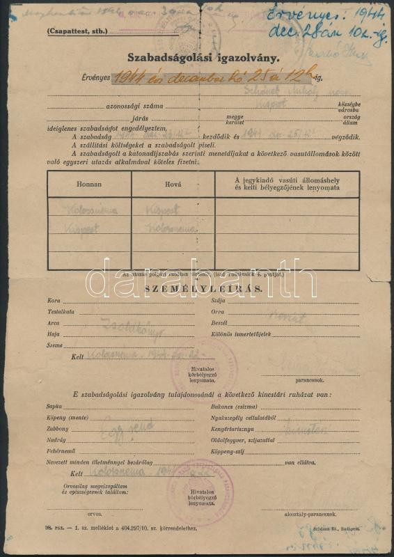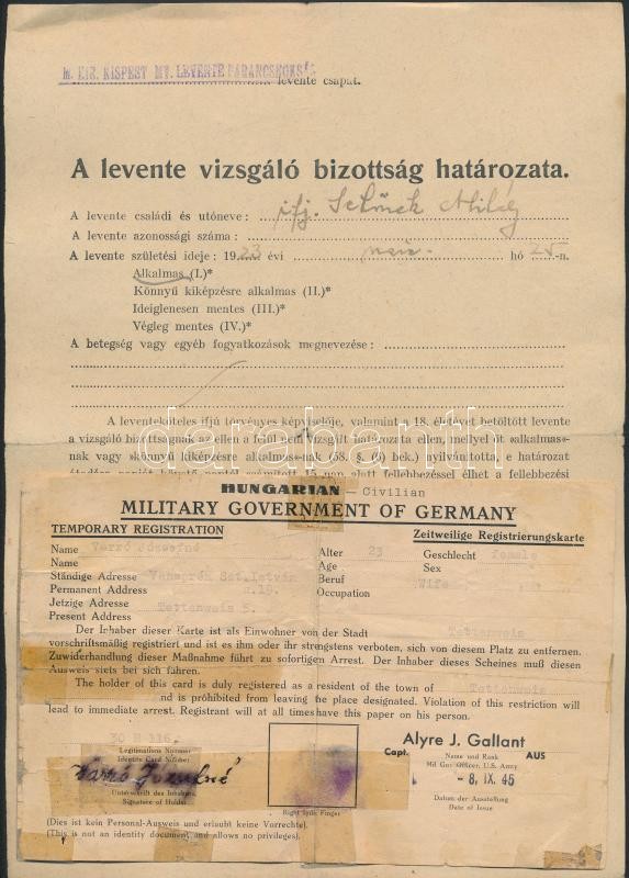 1942-44 Vegyes okmány tétel, 4db: Népfölkelési igazolványi lap; szabadságolási igazolvány; A levente vizsgáló bizottság határozata; ideiglenes regisztrációs kártya, különböző méretben és minőségben