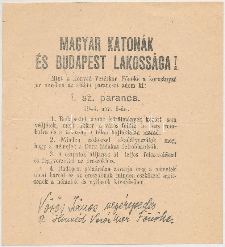 Leírás: 1944 1.sz. parancs Magyar katonák és Budapest lakosságához, röplap szép állapotban, 13x12cm