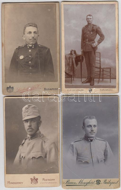 Leírás: cca 1900 Katonákat ábrázoló keményhátú fotó, budapesti, pozsonyi és bécsi műtermekből, 4 db, 11x7 cm / Soldiers, 4 vintage photos, 11x7 cm
