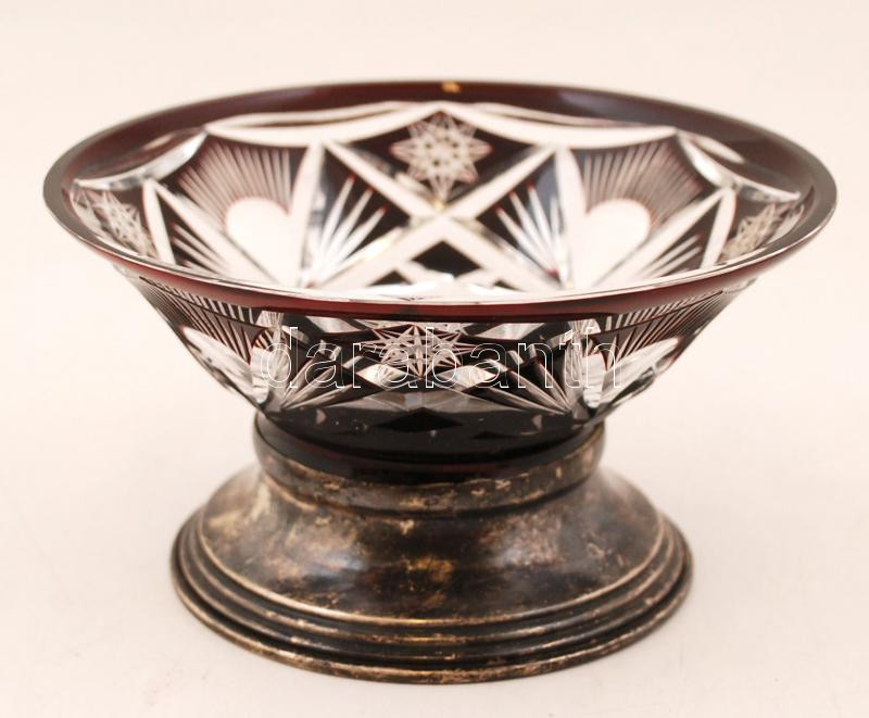 Leírás: Ezüst(Ag) talpú(jelzett) metszett üveg kínáló tál, apró hibával, d: 14 cm, m: 7 cm