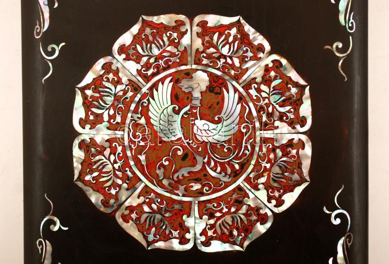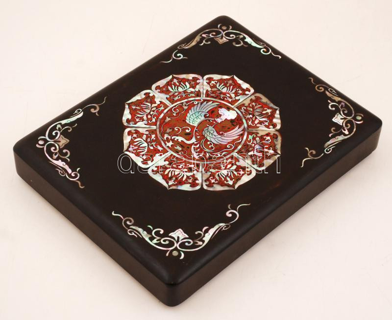 Leírás: Kínai fadoboz, gyöngyház berakással, kakas díszítéssel, szép állapotban / Chinese woodden box with shell inlay 22x28x5 cm