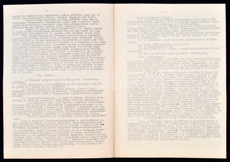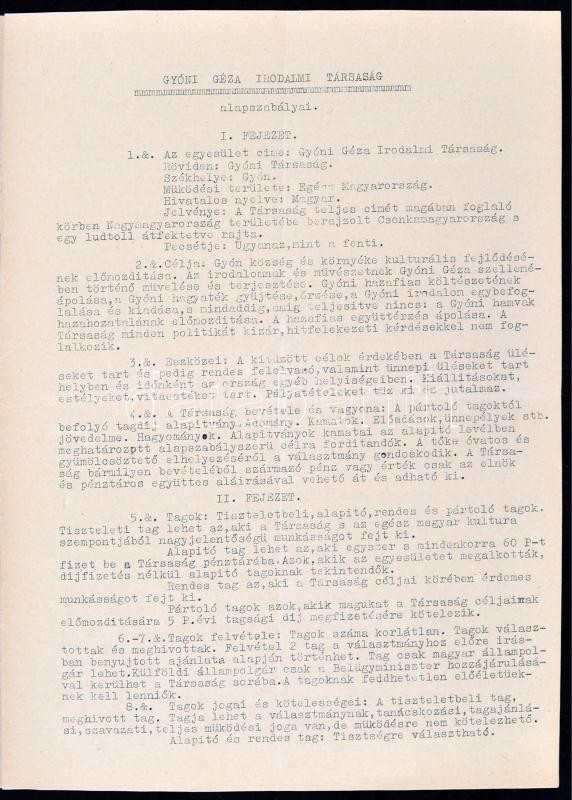 Leírás: 1933 Gyóni Géza Irodalmi Társaság alapszabályai, 6 gépelt oldalt, 29x20cm