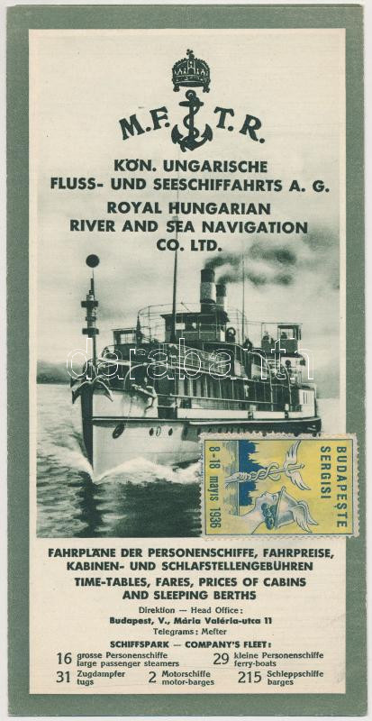 1933 M.F.T.R. Kön. Ungarische Fluss- und Seeschiffahrts A. G. ; M.F.T.R. Magyar Császári és Királyi Folyami és Tengeri Hajózási vállalat nyomtatványa képekkel, árakkal, bélyeggel. Szép állapotban, 20x30cm