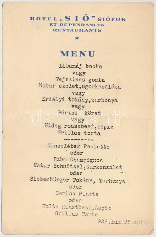 1938 Siófok, A Hotel "Sió" menükártyája https://www.darabanth.com/hu/260-Gyorsarveres/260.0/Festmeny-mutargy-papirregiseg-egyeb/Nyomtatvanyok~26/1938-Siofok-A-Hotel-Sio-menukartyaja~II1284098
