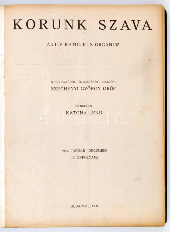 Leírás: Korunk szava. Aktív katolikus orgánum. Fel. szerk. Széchényi György. Szerk. Aradi Zsolt, Balla Borisz.