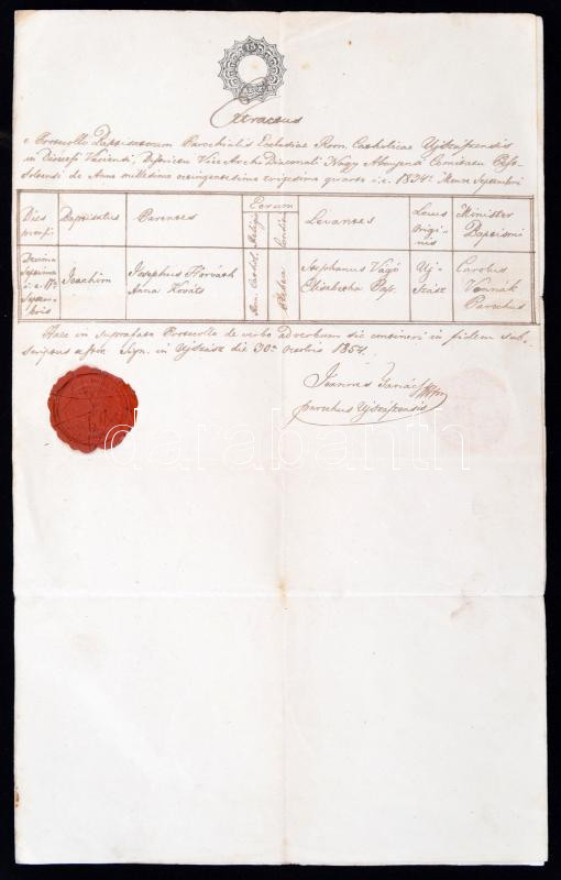 1854 Újszász, latin nyelvű római katolikus keresztelési anyakönyvi kiv... https://www.darabanth.com/hu/260-Gyorsarveres/260.0/Festmeny-mutargy-papirregiseg-egyeb/Okmanyok~15/1854-Ujszasz-latin-nyelvu-romai-katolikus-keresztelesi-anyakonyvi-kivonat-szignettaval-to~II1286262