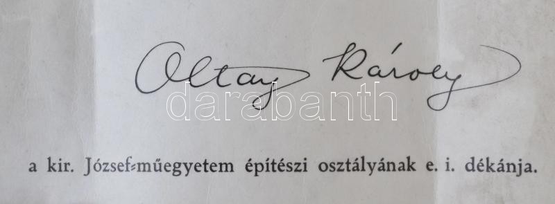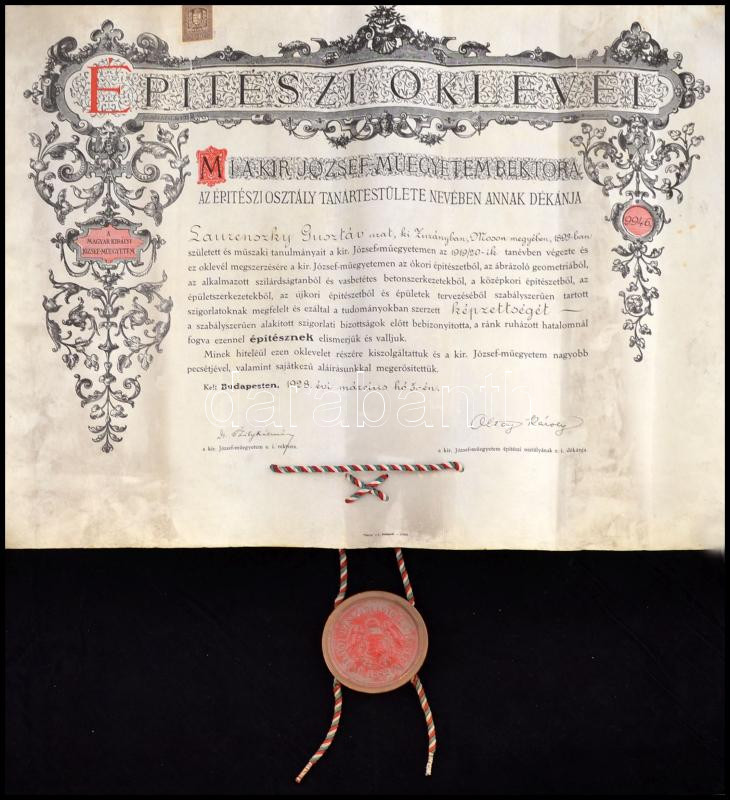 Leírás: 1928 A Magyar Királyi József-Műegyetem építészi oklevele Szily Kálmán rektor és Oltay Károly dékán aláírásával, szép állapotú függőpecséttel.