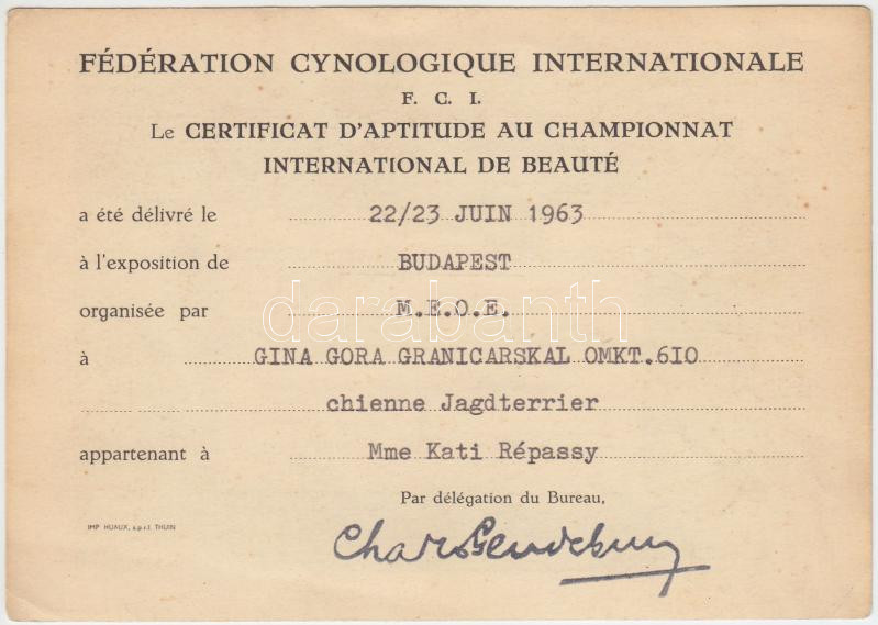 Leírás: 1963 a Fédération Cynologique Internationale francia nyelvű versenyképesség-igazolása magyar nyelvű gazda részére