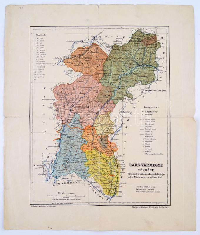 Leírás: 1907 Bars vármegye térképe, kiadja a Magyar Földrajzi Intézet Rt., szakadással, 37x30 cm